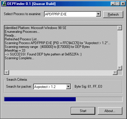 | OEPFinder | OEPFinder is a tool used to locate the Original Entry Point of packed Win32 programs. It supports a variety of packers including "ASProtect" :) For more details, refer the "readme.txt" within the package. I'm always interested in hearing ways to improve this program. Do drop me a line, if you think you can contribute. |